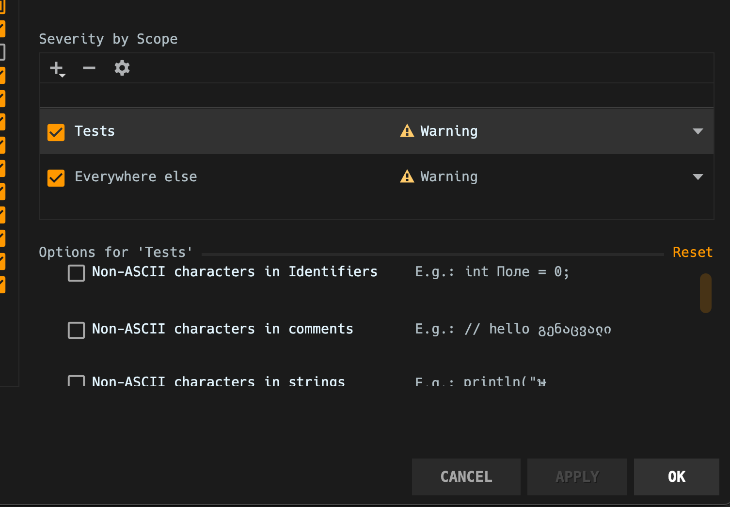 여기서 주의점은 우리는 테스트 코드에만 이 convention 을 해제할 것 이기 때문에 옵션 체크 박스 바로 위에 Scope 에서 tests 만 한정 지어줍니다.